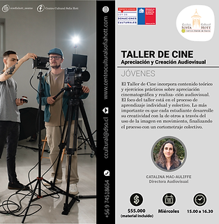 El taller de cine incorpora contenido teórico y ejercicios prácticos sobre apreciación cinematográfica y realización audiovisual. El foco del taller está en el proceso de aprendizaje individual y colectivo. Lo más importante es que cada estudiante desarrolle su creatividad con la de los otros a través del uso de la imagen en movimiento, finalizando el proceso con un cortometraje colectivo.